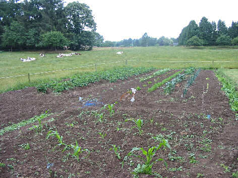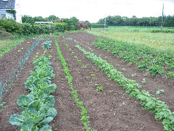 As you can see, I tried a bit of everything. This is July 2005. From the left:- Some lettuce at the far end. Then a row of leeks (about 50), a row with a dozen Sprouts at this end and a dozen Broccoli at the far end with lettuce in between. A row of carrots, then a dozen small celery, Dwarf French Beans, Winter Broccoli, then several rows of potatoes. No problem with weeds at this stage, though that did change, with Black Nightshade becoming a serious issue. |