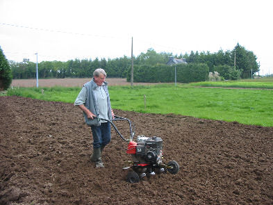 Well this is me, the farmer has ploughed the 'potager', broken the crust, and left it in a loose state to enable me to work the soil to a good depth. Its early May 2005. The plan was born at the end of 2004, to cultivate an area of ground and enjoy home grown vegetables. Not certain what to grow, the only experience is of the previous year when I 'experimented' with Leeks, Potatoes, lettuce and other bits and pieces. |